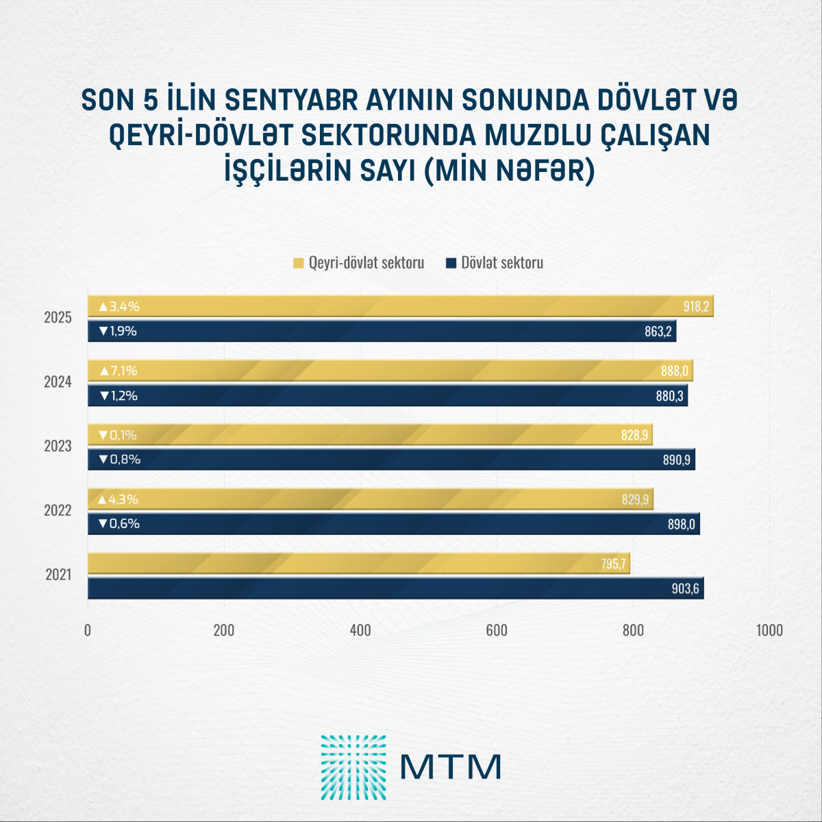Son beş ilin məlumatları göstərir ki, 2021–2025-ci illər üzrə Azərbaycanda muzdlu işçilərin sayı dövlət və qeyri-dövlət sektorlarında fərqli istiqamətdə inkişaf edib. Media Təhlil Mərkəzinin təhlilinə görə, qeyri-dövlət sektorunda göstəricilər stabil artım meyli nümayiş etdirib, dövlət sektorunda isə tədrici azalmalar müşahidə olunub.