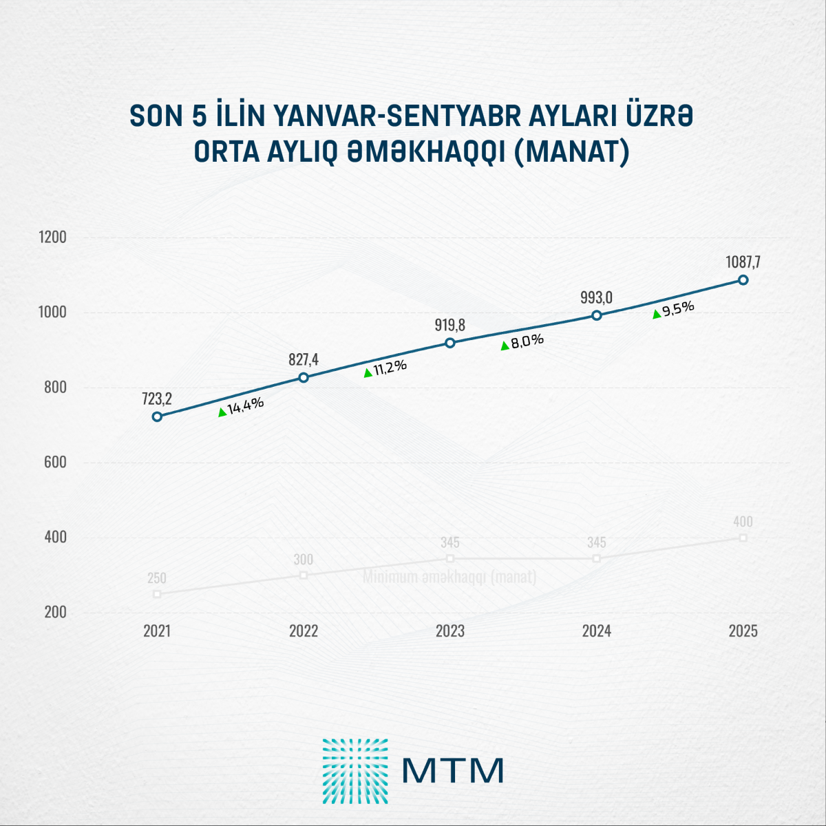 2025-ci ildə artım templəri daha da güclənib və orta aylıq nominal əməkhaqqı 1087,7 manat səviyyəsində qeydə alınıb. Bu, bir il ərzində 94,7 manat və ya 9,5% artım deməkdir.
