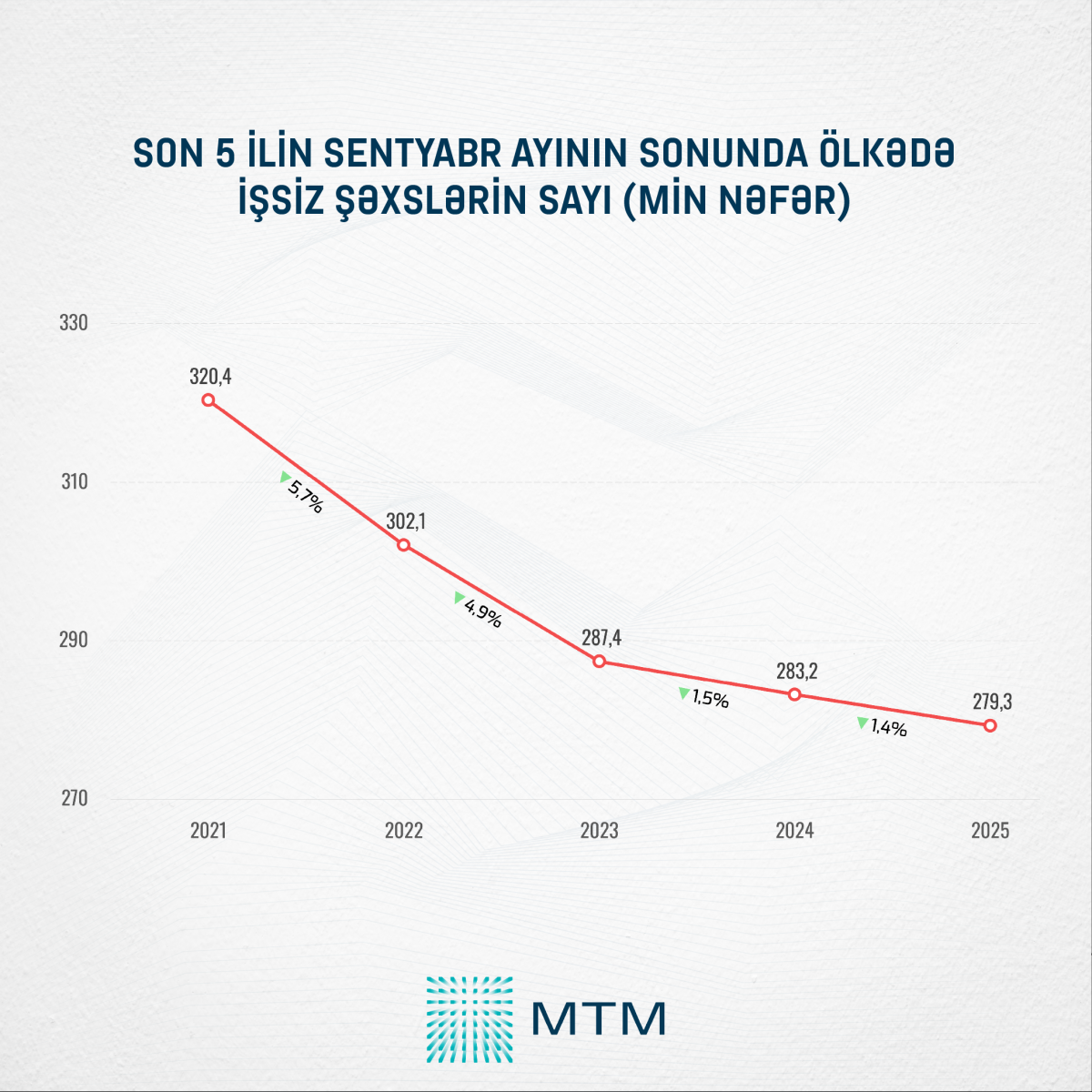 2025-ci ildə də işsizliyin azalması davam edərək göstərici 279,3 min nəfərə enib. Bu, son bir ildə 3,9 min nəfər və ya 1,4% azalma ilə xarakterizə olunur.