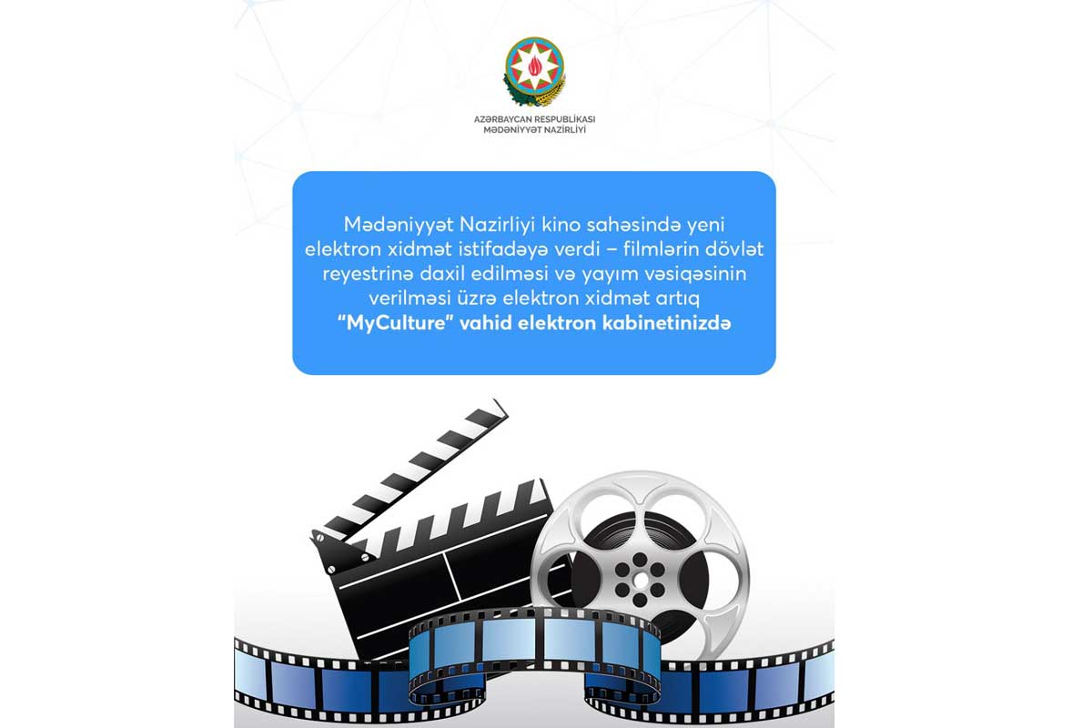 Bu xüsusda, Azərbaycan Respublikasının Mədəniyyət Nazirliyi “e-Culture” Strategiyasına uyğun olaraq, kino klasterinin rəqəmsal transformasiyası çərçivəsində “Filmlərin dövlət reyestrinə daxil edilməsi və yayım vəsiqəsinin verilməsi” elektron xidməti istifadəyə verib.