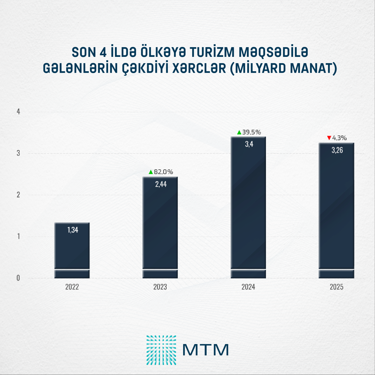 Rəsmi statistik məlumatlara əsasən, 2025-ci ildə ölkəyə turizm məqsədilə gələn şəxslərin xərcləri 3,26 milyard manat təşkil edib. 2024-cü illə müqayisədə turist sayının azalması fonunda bu göstərici 4,3 faiz və ya 0,14 milyard manat azalıb. Qeyd olunmalıdır ki, ən yüksək xərcləmə göstəricisi 2024-cü ilə təsadüf edir.