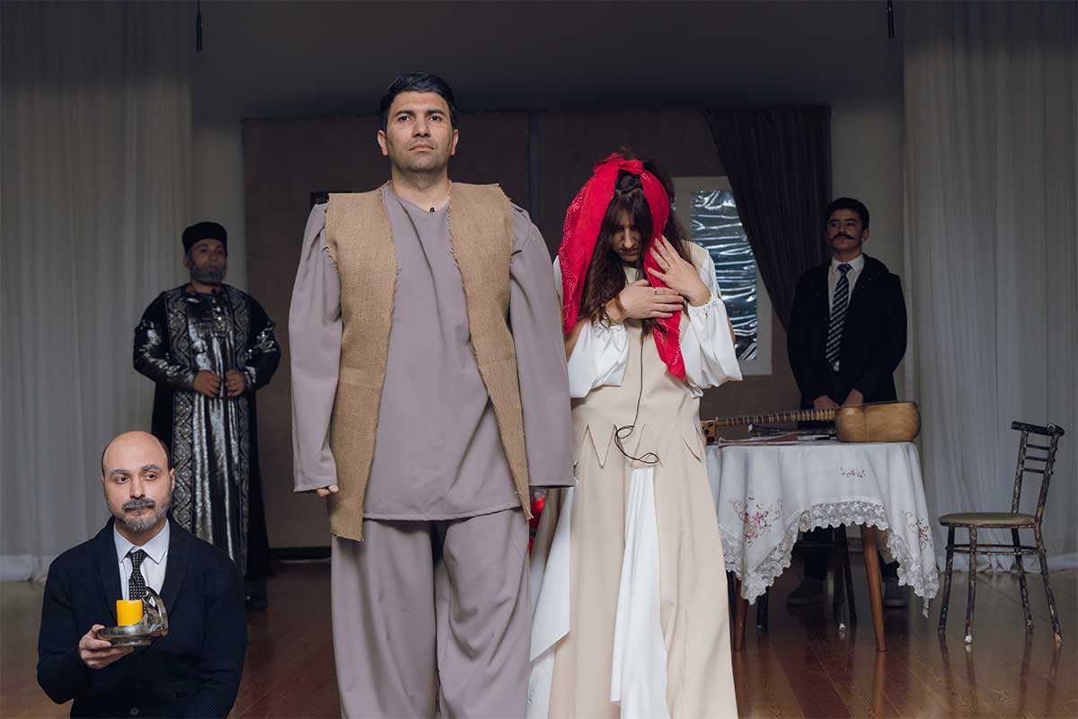 Səhnə həllində yazıçının təqiblərə məruz qalması, jurnal redaktorluğundan uzaqlaşdırılması və əsərlərini sobada yandırmaq məcburiyyətində qalması dramatik kulminasiya nöqtəsi kimi təqdim olunub. Yandırılan vərəqlərdən doğan obrazların səhnədə canlanması tamaşaya simvolik və emosional dərinlik qatıb. Qeyd edək ki, tamaşanı təqdim edən teatr truppası məktəbin müəllim və şagirdlərindən ibarətdir. Tamaşanın ssenari müəllifi Fidan Məmmədova, rejissoru Murad Allahverdi,təşkilatçısı isə Şükufə İsmayılovadır.