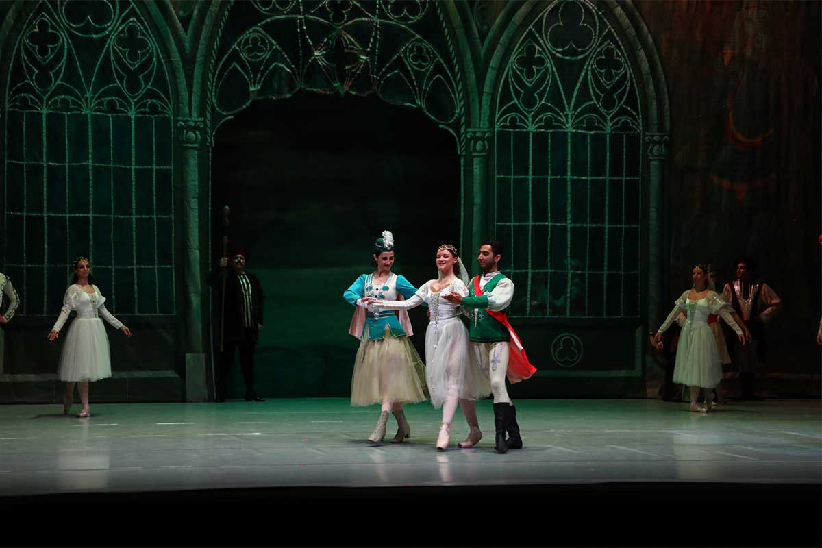 Klassik balet janrında olan tamaşa 3 pərdədən və 4 şəkildən ibarət olub.